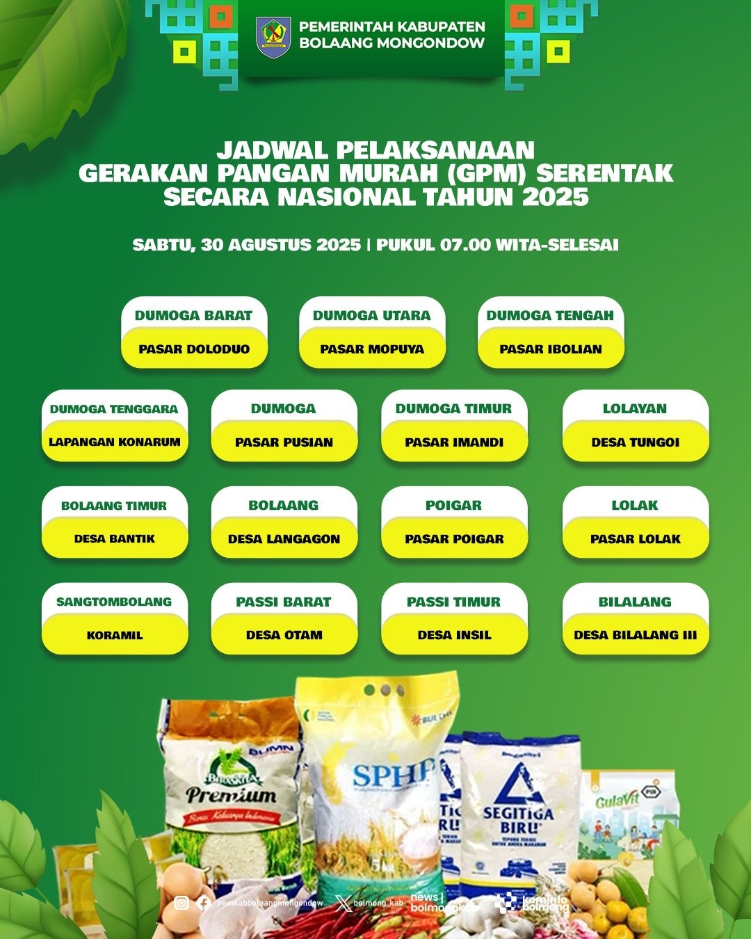 Kepala Dinas Ketahanan Pangan (DKP) Bolmong, I Wayan Mudiyasa, menjelaskan kegiatan tersebut merupakan bagian dari GPM nasional yang digelar serentak di 8.000 kecamatan seluruh Indonesia. Pelaksanaan di Bolmong sendiri berkolaborasi dengan TNI-Polri dan Bulog, serta mendapat dukungan penuh dari Bupati dan Wakil Bupati