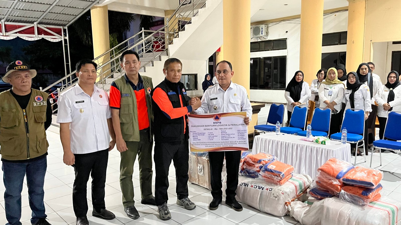 Bantuan tersebut diserahkan secara langsung oleh Tenaga Ahli BNPB RI, Mayjen (Purn) Mohammad Lutfi Beta, Bersama tim dari deputi Penanganan Darurat BNPB, dan diterima oleh Bupati Bolmong, Yusra Alhabsyi, didampingi Wakil Bupati Dony Lumenta serta sejumlah pejabat daerah. Kegiatan berlangsung di Kantor Bupati Bolmong, Rabu (5/11/2025).
