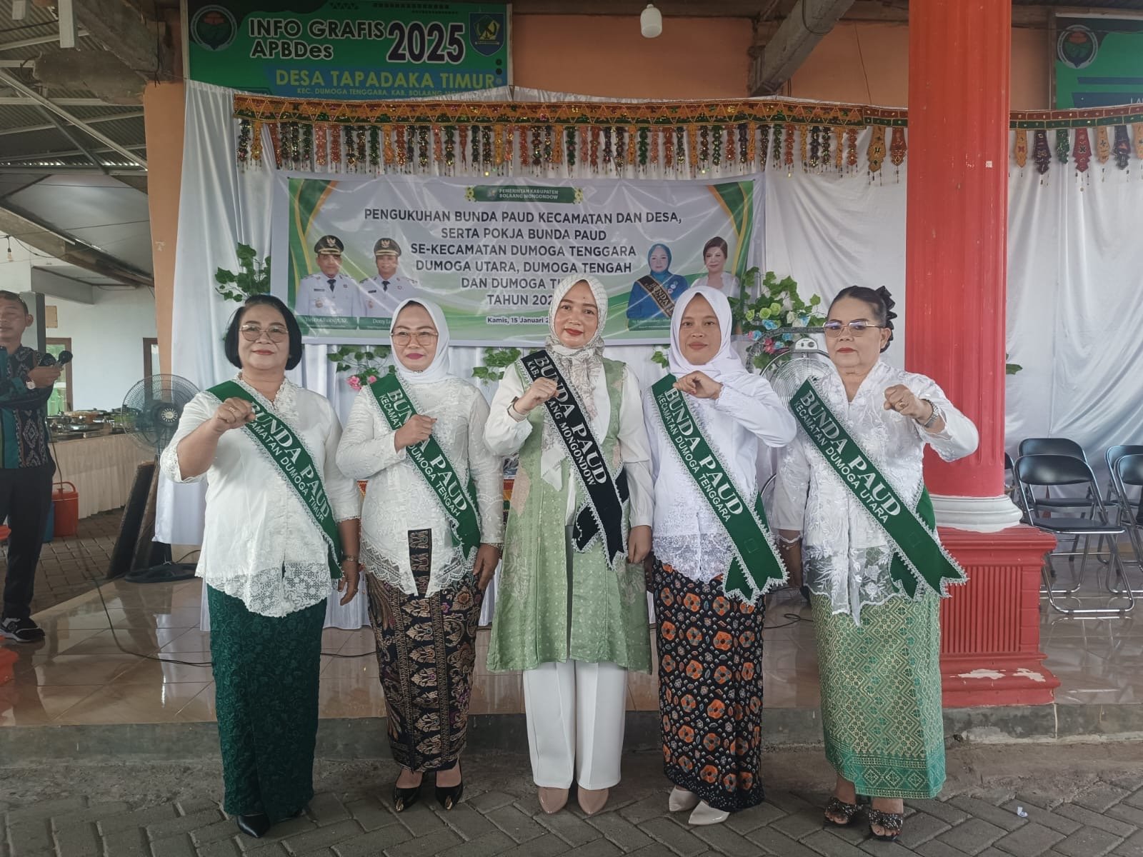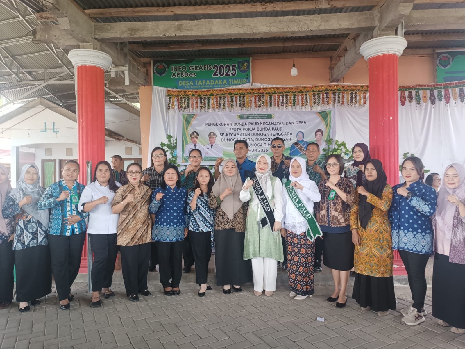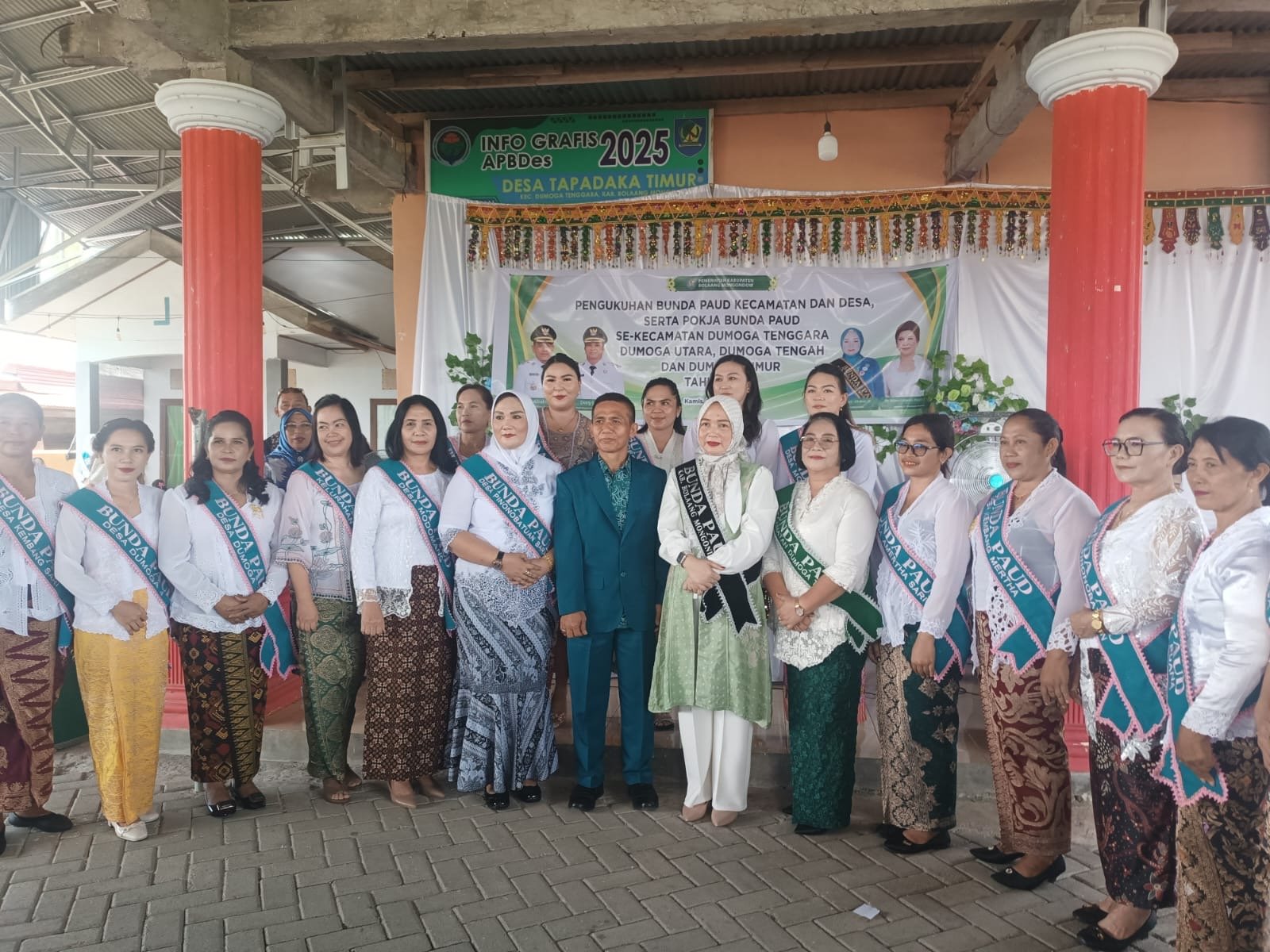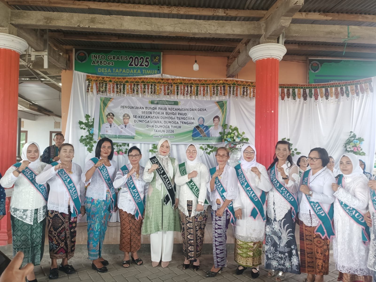 JUARAnews.co BOLMONG — Bunda Pendidikan Anak Usia Dini (PAUD) Kabupaten Bolaang Mongondow (Bolmong), Kalsum Alhabsyi, – Alhabsyi SE, mengukuhkan Bunda PAUD Kecamatan Dumoga Tenggara, Dumoga Utara, Dumoga Timur, dan Dumoga Tengah, Kamis (15/1/2026). Kegiatan tersebut dilaksanakan di Balai Desa Tapadaka Timur, Kecamatan Dumoga Tenggara.