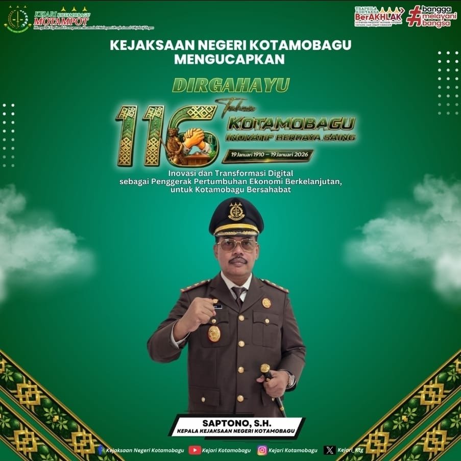 JUARAnews.co KOTAMOBAGU – Kepala Kejaksaan Negeri Kotamobagu, Saptono, S.H., turut menghadiri upacara peringatan Hari Ulang Tahun ke-116 Kota Kotamobagu yang berlangsung di Lapangan Boki Hotinimbang, Senin (19/1/2026).