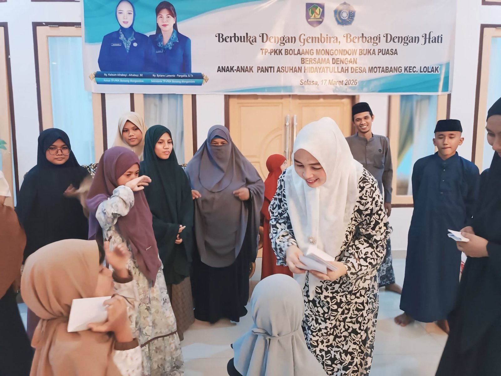 JUARAnews.co BOLMONG — Ketua Tim Penggerak Pemberdayaan dan Kesejahteraan Keluarga (TP PKK) Kabupaten Bolaang Mongondow, Ny. Kalsum Alhabsyi, SE, menggelar buka puasa bersama anak-anak Panti Asuhan Hidayatullah Desa Motabang, Kecamatan Lolak, Selasa (17/3/2026).